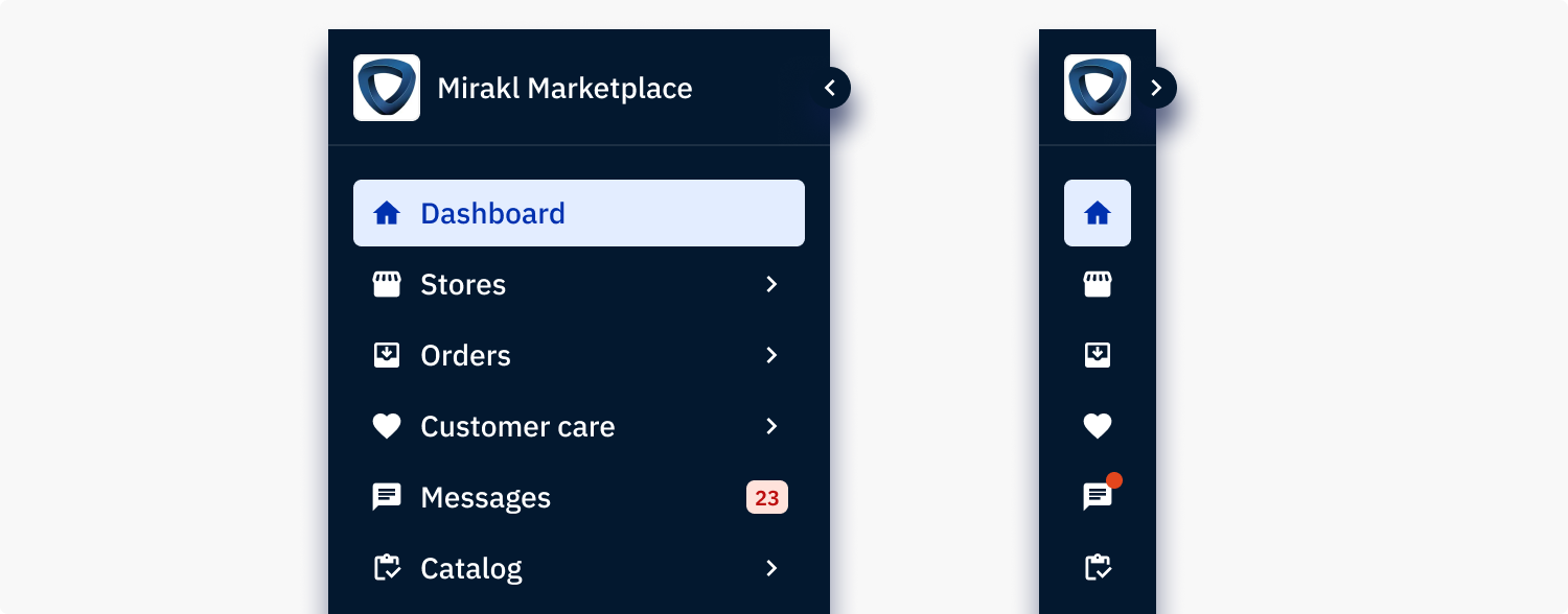 `Sidebar` always goes with [`Topbar`](https://design.mirakl.com/design/components/navigation/top-bar). While Sidebar allows users to navigate through various activities, `Topbar` is dedicated its profile and personal activities.